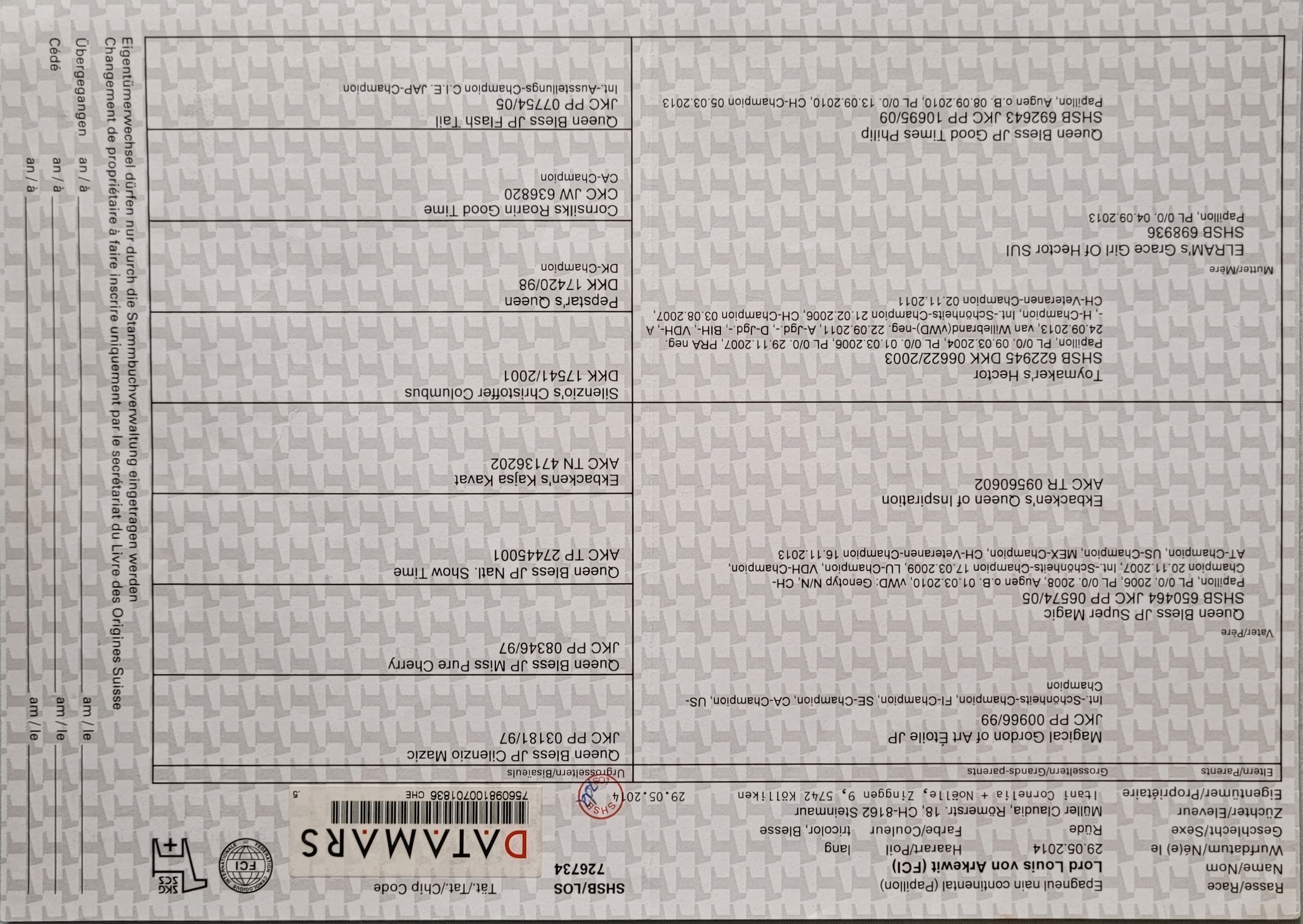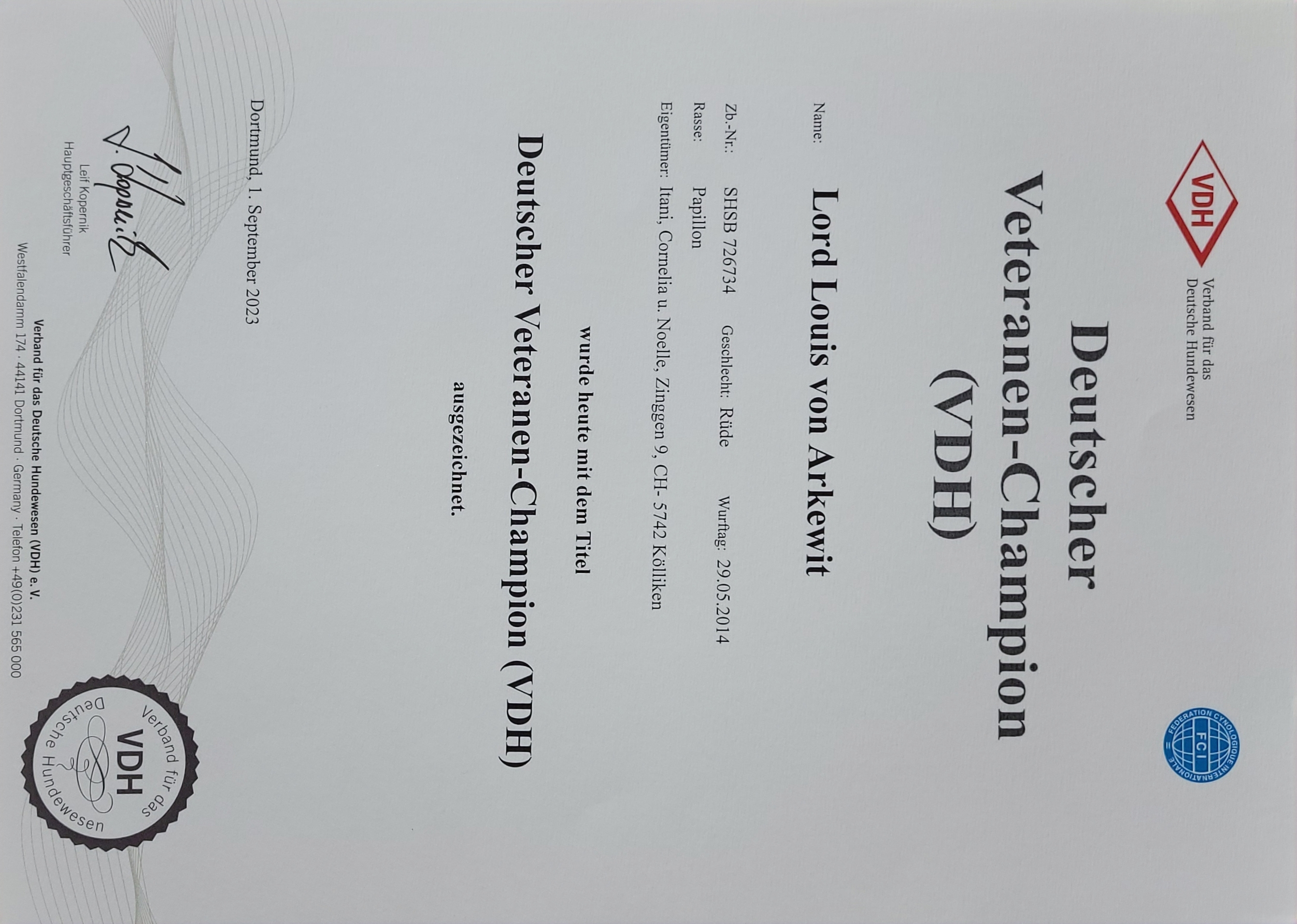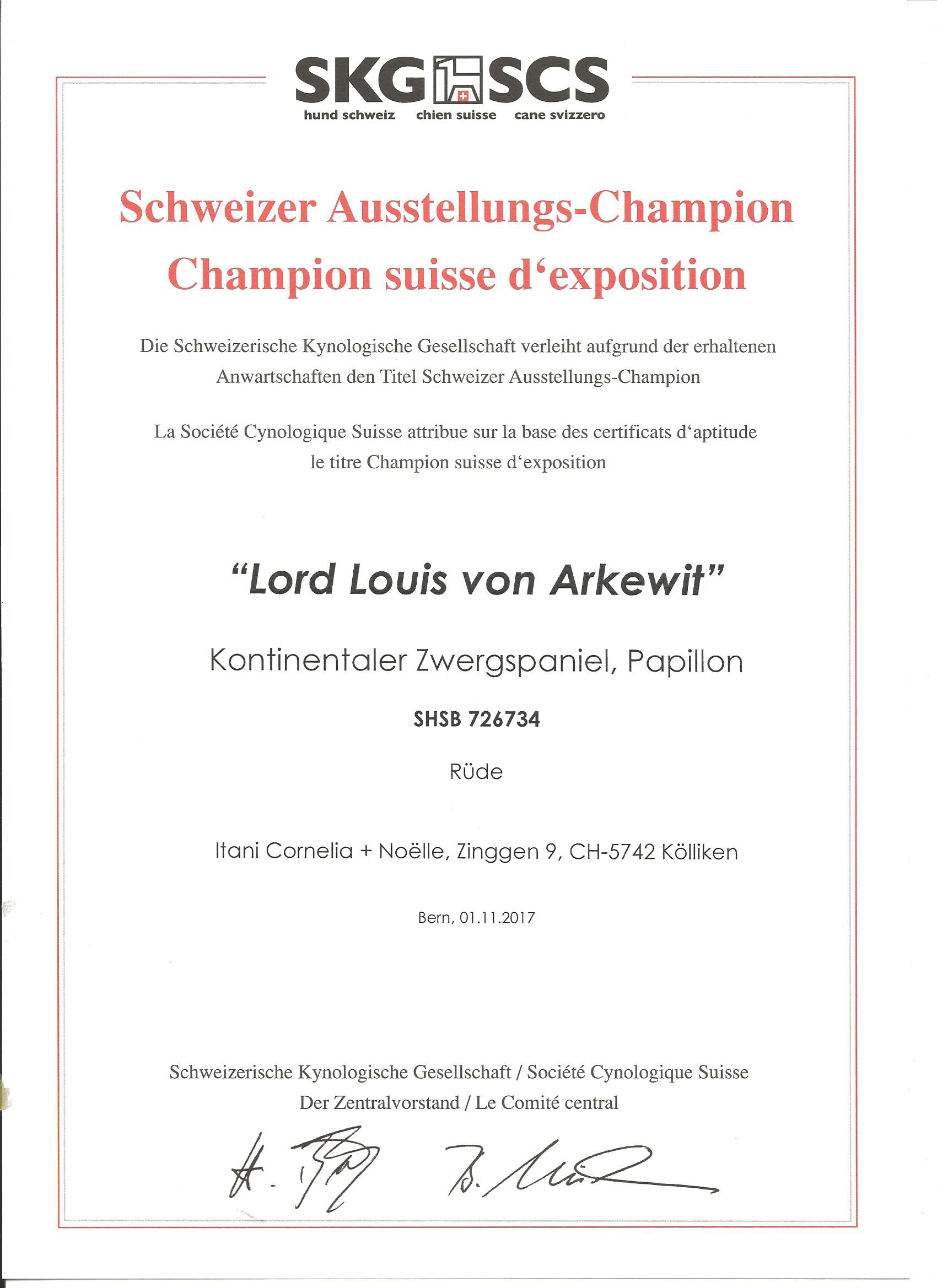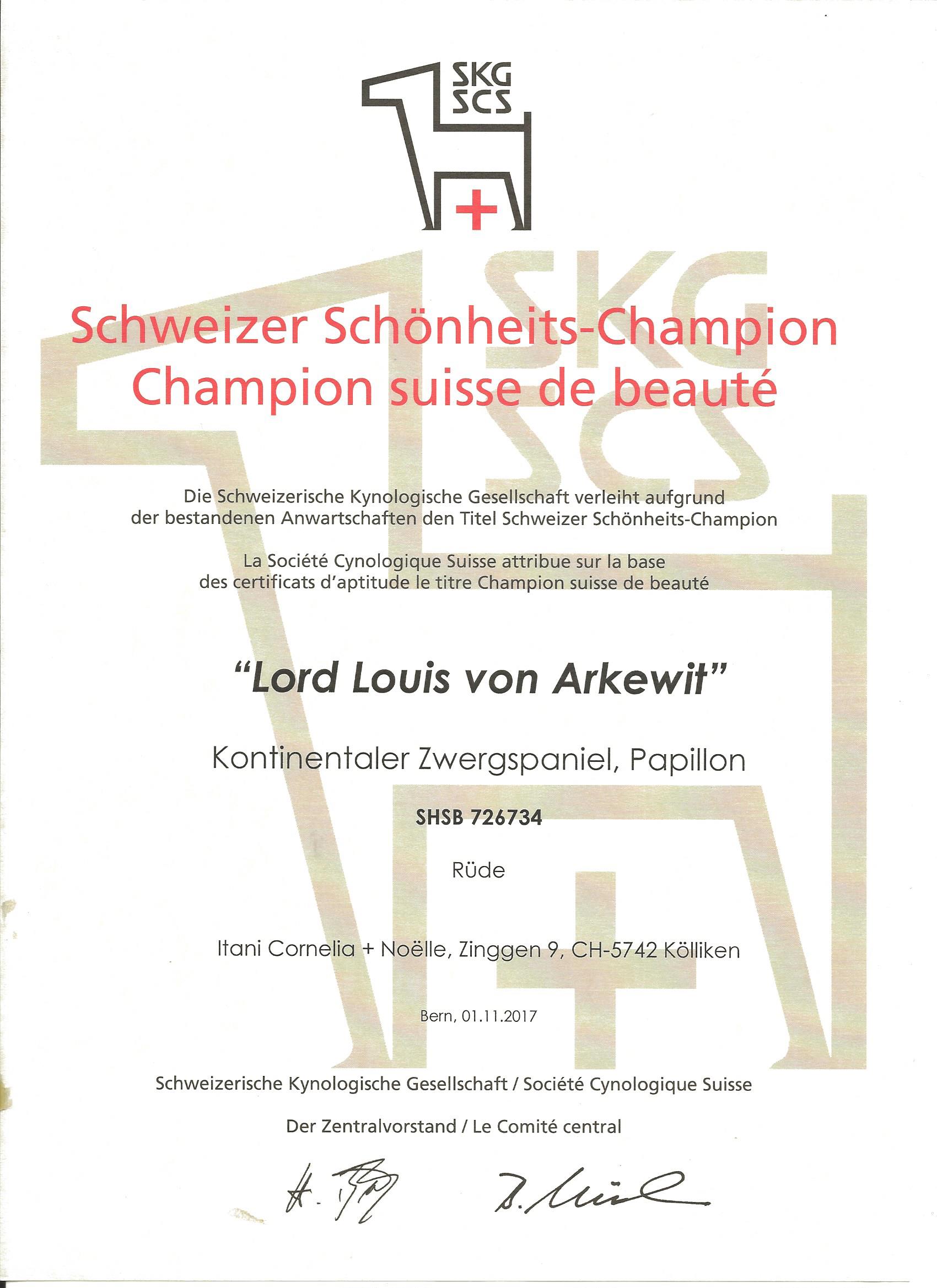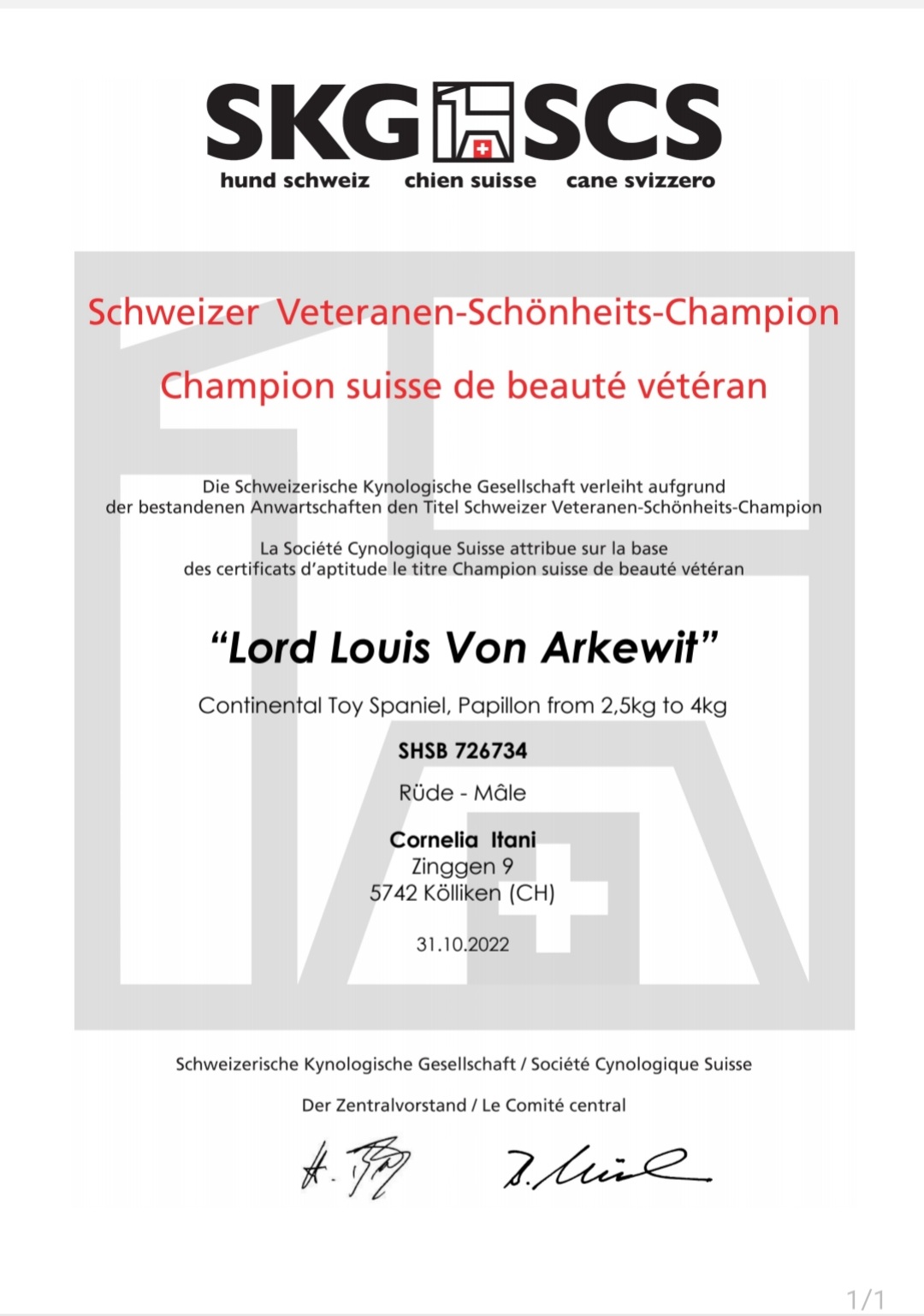 Schweizer Schönheits-Champion Schweiz. Ausstellungs-Champion Schweiz. Veteranen-Schönheits-Champion |